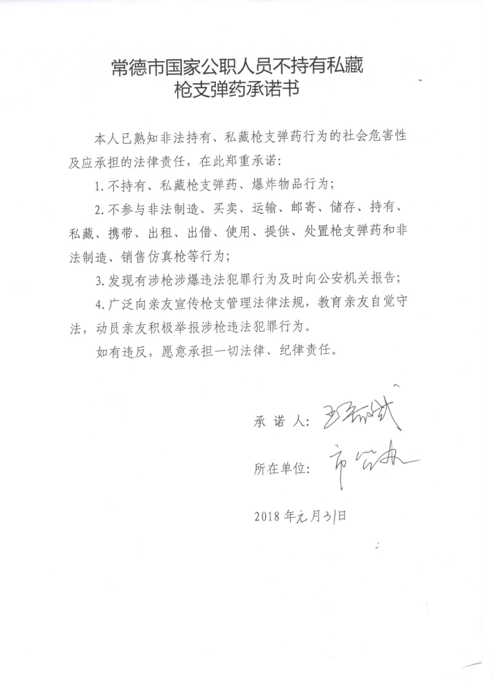 常德市国家公职人员不持有私藏枪支弹药承诺书